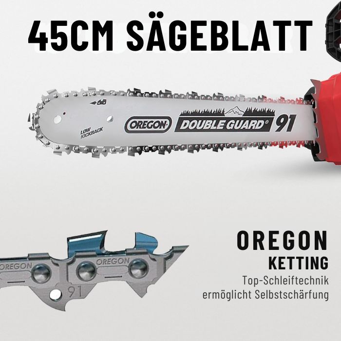 - Kettengeschwindigkeit: 23 m/s – Eine der schnellsten in ihrer Klasse für präzises und schnelles Sägen.