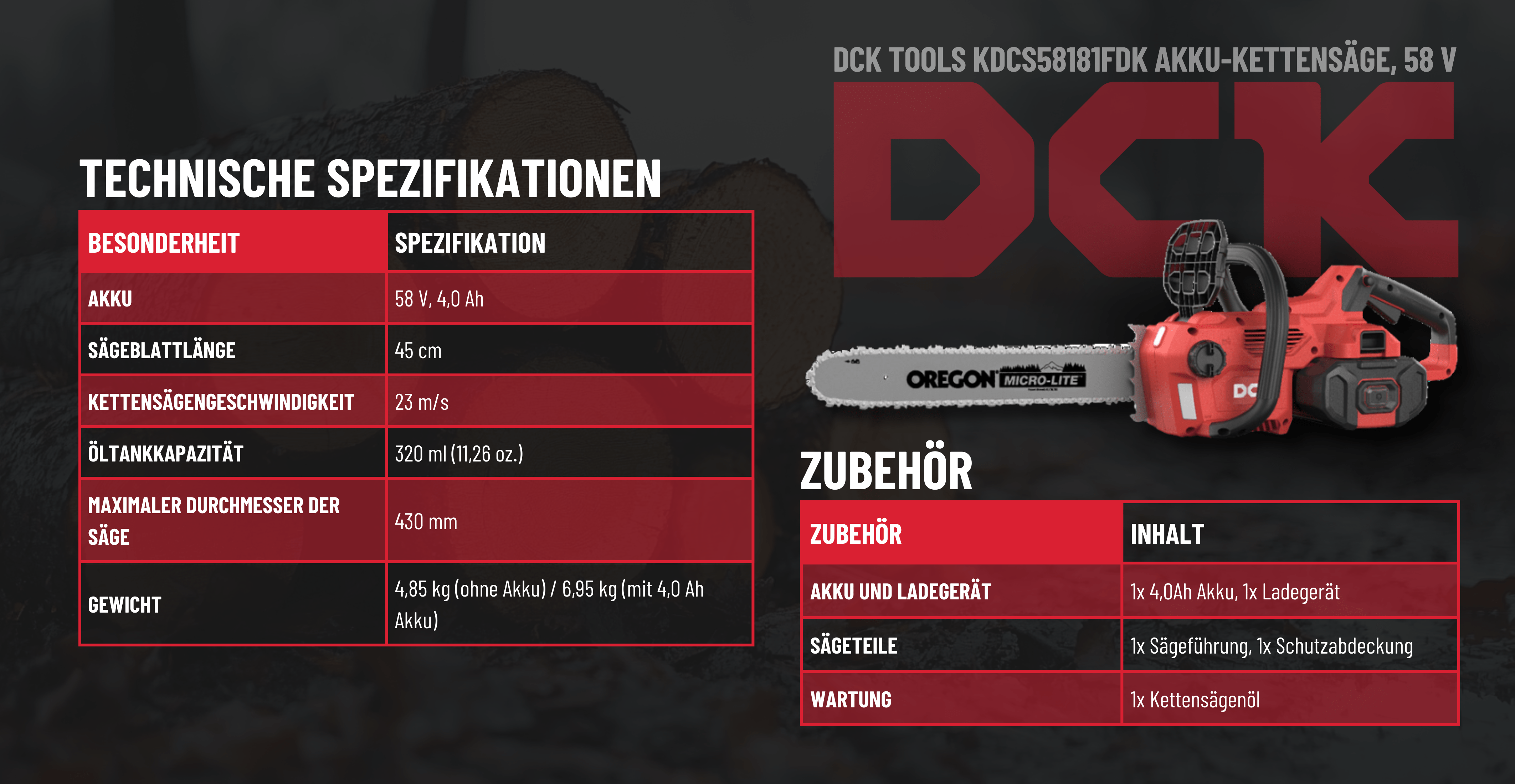 Mit diesen Eigenschaften ist die DCK 58V Akku-Kettensäge eine leistungsstarke und zuverlässige Wahl für Profis und Heimwerker. 🪵🔋