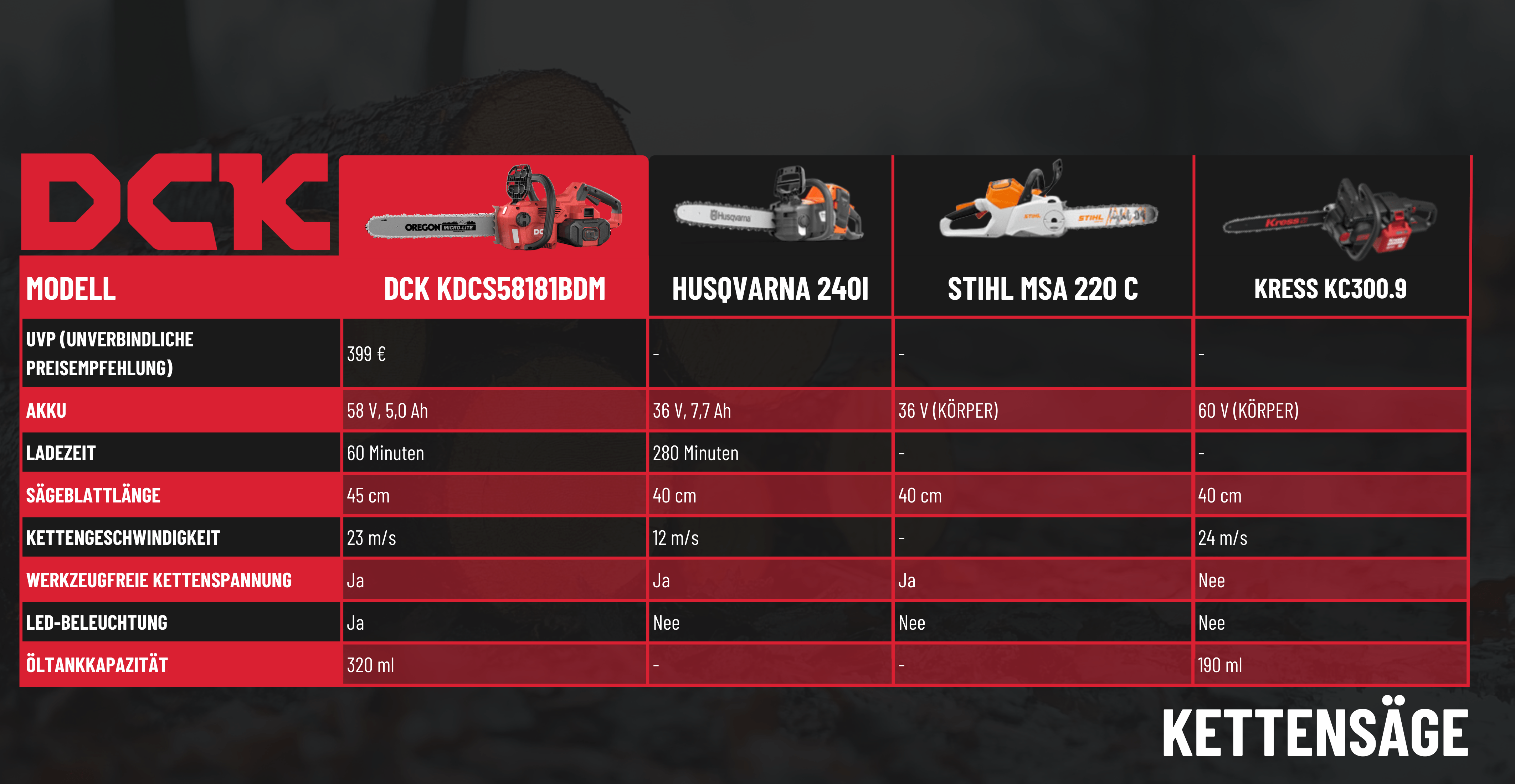 Nachfolgend sehen Sie, wie die DCK 58V Akku-Kettensäge im Vergleich zu anderen beliebten Modellen abschneidet. 🪵
