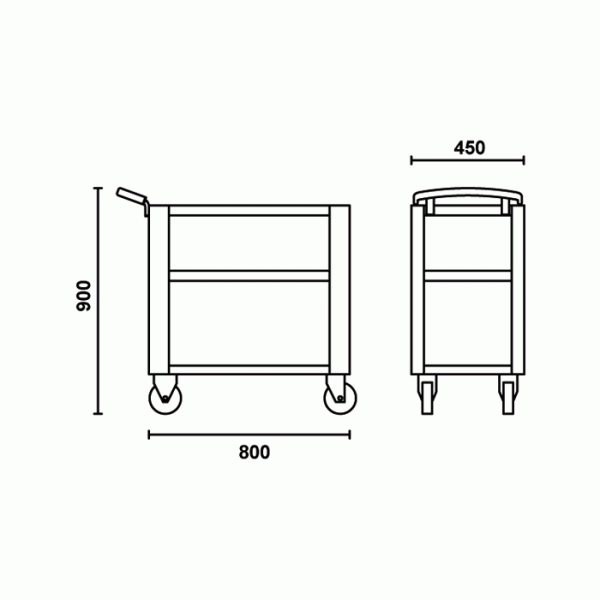 - Vier wielen diameter 100 mm: 2 vaste en 2 stuurwielen waarvan 1 voorzien van een rem