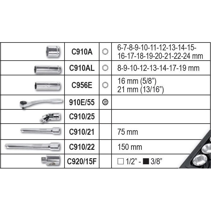 - C910A – 6-7-8-9-10-11-12-13-14-15-16-17-18-19-20-21-22-24 mm