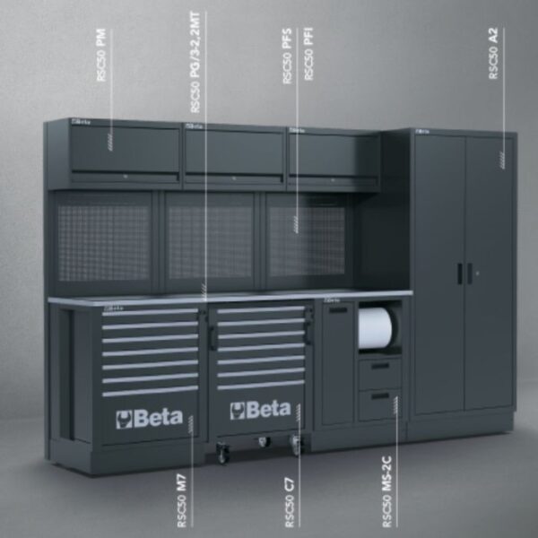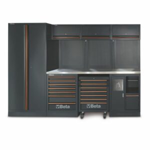 Die Beta RSC50 F Werkstatteinrichtung ist die ideale Lösung für Profis, die absolute Spitzenqualität verlangen. Diese robuste und komplette Werkstattlösung bietet alles, was Sie für eine organisierte und effiziente Arbeitsweise benötigen. Mit einer 2.240 mm langen und 700 mm tiefen Arbeitsplatte, mehreren Modulen sowie stationären und mobilen Aufbewahrungsmöglichkeiten kombiniert diese Einrichtung Funktionalität mit Flexibilität.