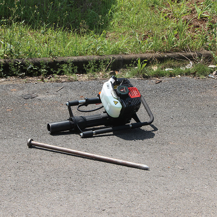Unser professioneller Benzin Pfahlramme nutzt einen leistungsstarken 4-Takt, 38cc Motor und ist in der Lage, Pfähle unter den rauesten Bedingungen in den Boden zu treiben.