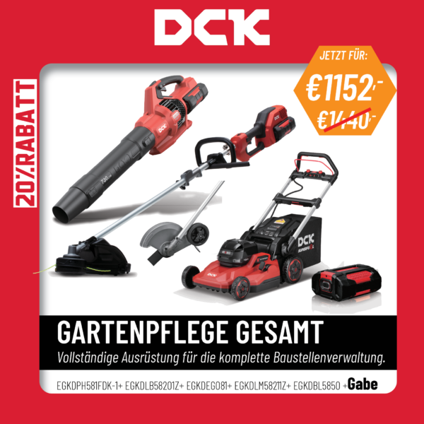 Das umfassendste Set für alle Gartenarbeiten. Das DCK Tools Gartenpflege Gesamtpaket enthält einen 58V Rasenmäher, Kombimotor mit Aufsätzen, zwei 5.0Ah Akkus und ein Schnellladegerät – für alle, die alles auf einmal erledigen möchten.