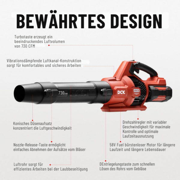 Mit dem DCK 58V Laubbläser genießt du außergewöhnliche Leistung und Komfort. Dank des leichten, ergonomischen Designs und der variablen Geschwindigkeit kannst du jede Reinigungsaufgabe mühelos und präzise erledigen. Egal ob du Blätter entfernst, Schmutz beseitigst oder Schnee wegbläst – dieser Laubbläser ist dein perfekter Partner.
