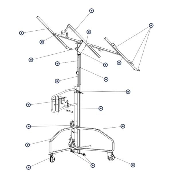 - Ausgestattet mit 3 Rollen, davon 2 mit Bremsen und 2 Stabilisierungs-/Transportrollen.
