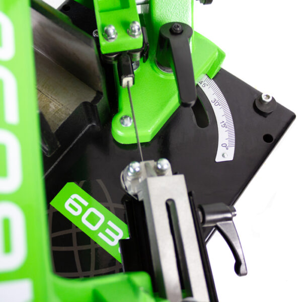 Bei (Holz-)Kappsägen spricht man von Doppelgehrung, wenn man sowohl horizontal als auch vertikal links/rechts einen Winkel einstellen kann. Mit Bandsägen geht das nicht, die sollen immer rechtwinklig senkrecht ins Material gehen. Doppelgehrung bedeutet, dass Sie horizontal links und horizontal rechts im Winkel sägen können. Sie sehen dies nur bei einigen stationären Modellen. Der 6038 hat daher eine einfache Gehrung, bis zu 45° (±50°, wenn es wirklich sein muss). Sie können damit die gleichen Winkel schneiden wie mit Doppelgehrung, aber Sie müssen sich etwas mehr Gedanken darüber machen, wie Sie Material zuführen.