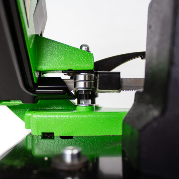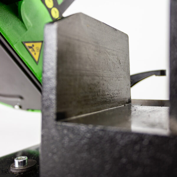 Auf der Zufuhrseite (links) wird Ihr Material von der Klammer der Maschine gehalten. Steht auf der Druckseite viel heraus? Unterstützen Sie diese dann auf gleicher Höhe, damit Ihr Material nicht hängen bleibt, oder unschöne Risse/Brüche am Schnittende entstehen. Stellen Sie außerdem sicher, dass Ihr Material flach ist, wenn Sie es ausüben.