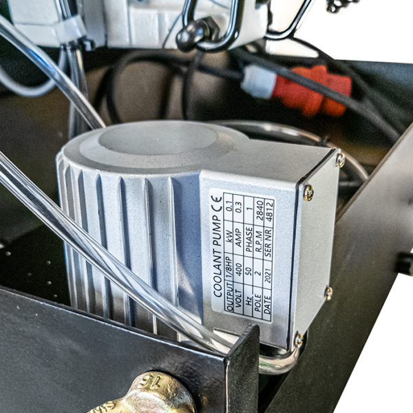 Kühlpumpe & automatisches Sacksystem – Die Anwesenheit einer Kühlpumpe und eines automatischen Sacksystems verbessert die Effizienz und Benutzerfreundlichkeit dieser Bandsägemaschine.