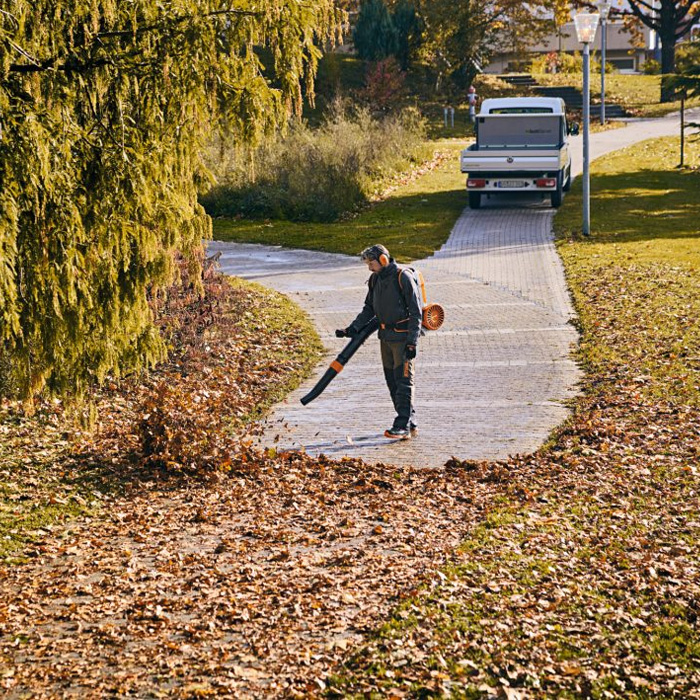 Der Ruckentragbarer STIHL BGA 300 Akku-Laubbläser ist mit dem neuen Geräuschreduzierungssystem STIHL Noise Reduction ausgestattet. Dieses System reduziert die Lärmemissionen für Passanten und Anwohner deutlich. Darüber hinaus sorgt die Reduzierung bestimmter Frequenzen für einen angenehmeren Klang. Gleichzeitig ist die Reinigungsleistung dank der maximalen Luftgeschwindigkeit von 86 m/s besonders hoch. Damit können Sie auch schweres, nasses Laub schnell wegblasen und Parks, Wiesen, Wege und Straßen effizient reinigen.
