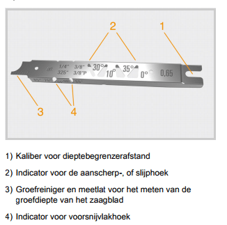 - Zur Überprüfung des Vorschnittwinkels, des Anziehwinkels, der Zahnlänge und des Tiefenbegrenzers.